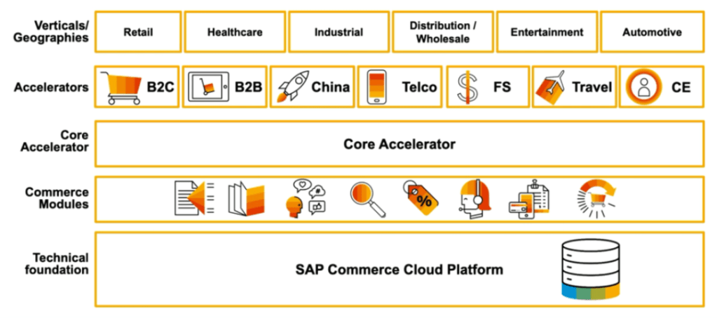 SAP Commerce is a collection of Java modules. These modules contain several extensions to complete a set of common functionalities.