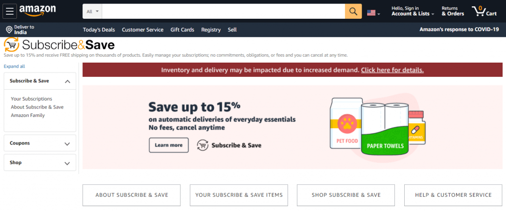This model offers regular subscription services for a ready supply of various products. Think of daily utility products such as food, groceries, razors, or even toiletries. This model caters specifically to such needs. Consumers usually opt for this model because the products that are offered have consistent consumption rates. This is best from a consumer’s perspective because they need not check the price of the product every time they renew the subscription. For example, Amazon’s ‘Subscribe and Save’ option gives a discount of 10% to 15% per subscription if the customer receives products from 5 or more subscriptions in a given month